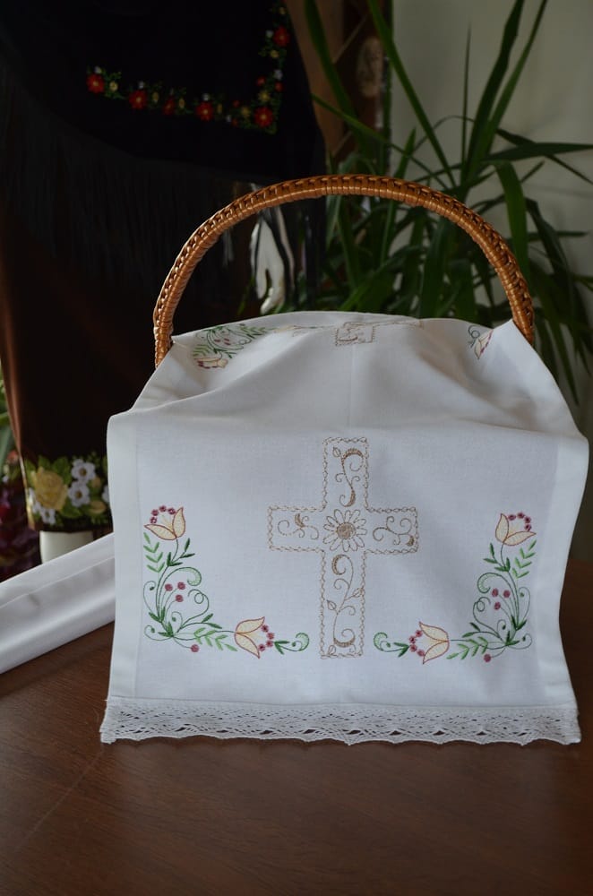 Prosop pentru Sărbătorile Pascale, brodat la mașină, pe pânză albă din bumbac, cu aspect asemănător pânzei de casă, finisat cu dantelă din bumbac. Dimensiuni : 40 x 77cm. Menționăm că broderia crucii este făcută cu fir metalic .
