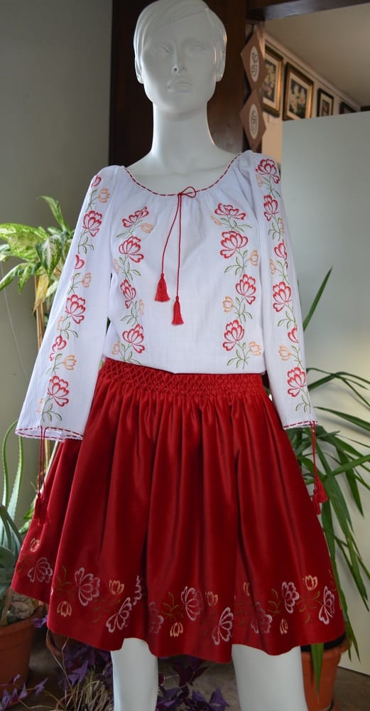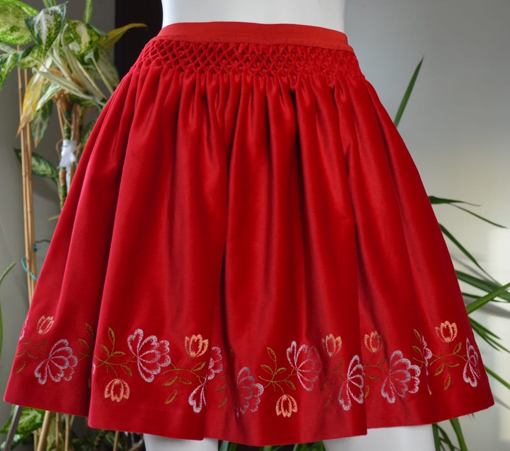 Fustă din catifea de bumbac, cu broderie la poale, ornamentată în partea de sus cu motiv lucrat manual, în punct de fagure și cu bata din elastic. Menționăm că dimensiunea prezentată pentru talie este a elasticului neîntins. Talie 58cm., lungime 44cm. Dacă doriți o costumație completă recomandăm achiziționarea fustei împreună cu produsul DIB118.