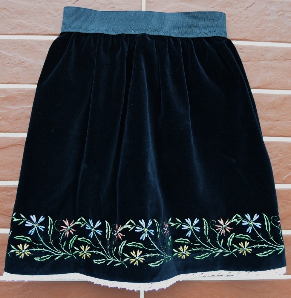 Fustă din catifea de bumbac, cu broderie, dantelă din bumbac alb atașată la poale și cu bata din elastic. Calitatea catifelei și a execuției broderiei conferă probabil, cel mai bun raport CALITATE/PREȚ de pe piața de specialitate, la ora actuală. Recomandăm acest produs și ca posibilă parte componentă a unei vestimentații tradiționale deoarece croiul și dantela atașată la poale merg perfect combinate cu cămașă națională sau ie. Dimensiuni: talie 46cm., lungime 34cm.