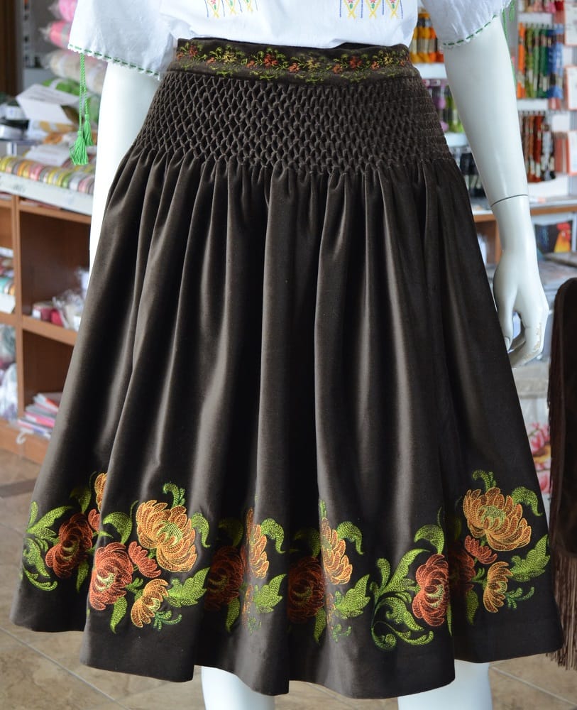 Fustă din catifea de bumbac, cu broderie la poale, ornamentată în partea de sus cu motiv lucrat manual, în punct de fagure. Menționăm că bata fustei este brodată. Dimensiuni: talie 92cm., lungimea 64cm.