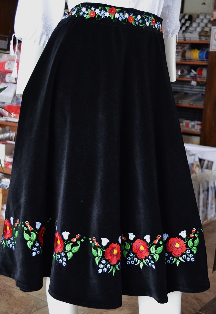 Fustă brodată, din catifea de bumbac, croită semicloș, cu broderie la poale și pe bată. Talia fustei este de 90cm, lungimea de 68cm.