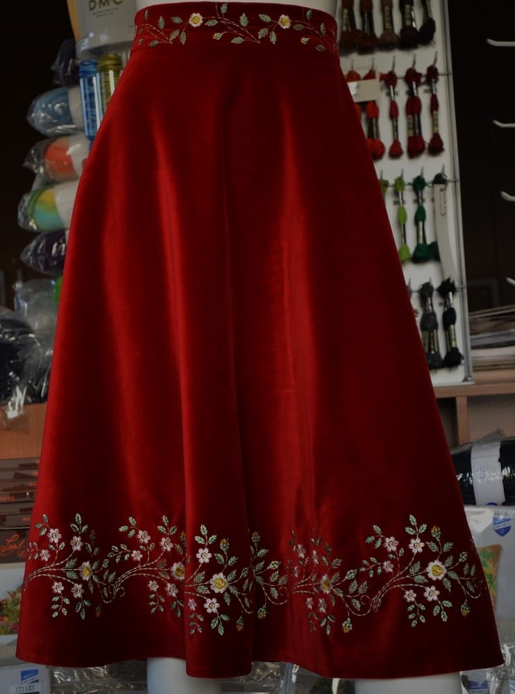 Fustă brodată, din catifea de bumbac, croită semicloș, cu broderie la poale și pe bată. Talia fustei este de 90cm, lungimea de 70cm.