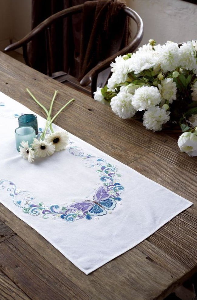 Conținut kit : pânză din bumbac, cu desen imprimat care dispare la spălat, ac special, fire mouline bbc100% marca DMC, instrucțiuni de lucru și imagine color. Modelul se lucrează în punct de contur, pas plat, cusătură lungă, punct de nod, punct rapid și punct țesut. Dimensiunile napronului sunt cca 38 x 142 cm.
