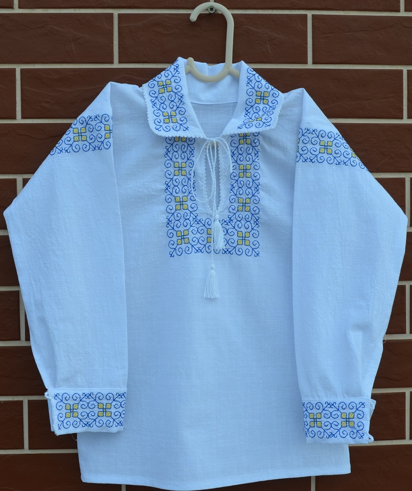 Cămașă pentru băieți din pânză de in, cu broderie pe manșete, guler, mâneci și piept. Menționăm că modelul brodat imită șătrăncile, un tip de cusătură manuală făcută pe cămășile naționale foarte vechi. Cămașa este finisată parțial manual cu motiv croșetat cu fir din bumbac 100%. Mărime 6-7 ani