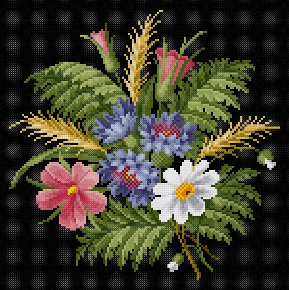 Kit pentru broderie manuală compus din: pânză Zweigart cu 9 fire/cm., fir mouline DMC bumbac 100%, ac special cu vârf bont și ureche alungită, diagramă și instrucțiuni de lucru. Modelul are 30 de culori, se lucrează în punct goblen și dimensiunea modelului cusut este 16/16 cm.