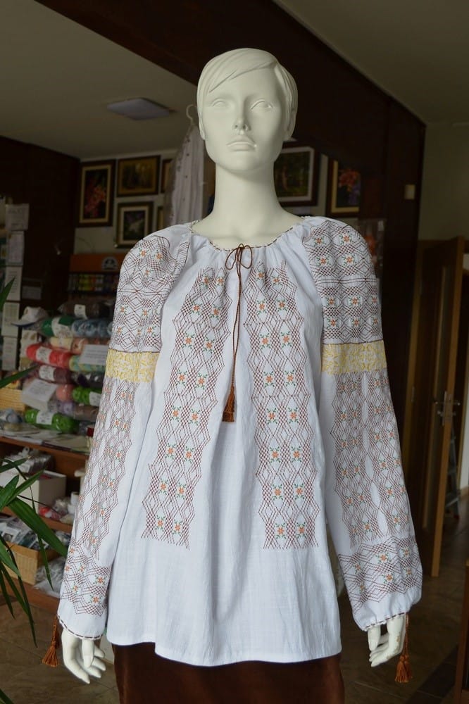 Cămașă brodată pe material din in, finisată cu dantelă din bumbac ornamentată cu șnur colorat, motivul broderiei aducându-ne aminte de cusăturile vechi în șătrănci sau contur, ca urzeală, și motiv floral miniatural în interior. Mărimea L