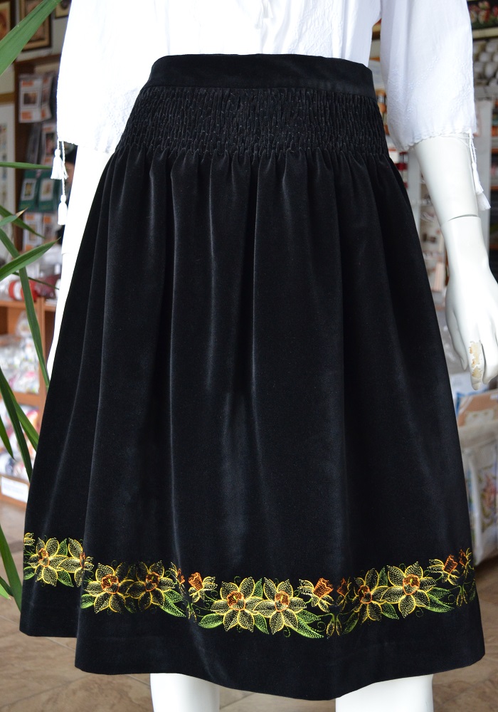 Fustă din catifea de bumbac, cu încrețitură elastică și broderie la mașină. Narcisele, elegante și suave, își fac loc printre preferințele doamnelor și domnișoarelor, fiind întâlnite tot mai des pe cămășile naționale. Ne-am gândit să venim cu o completare!!! Acest tip de croi este specific fustelor care se poartă și cu cămașă națională. Fiind mai comodă decât catrința, fusta din catifea poate fi parte a unei costumații tradițională modernă, lejeră și elegantă. Talia fustei este de 90cm. și lungimea de 65cm. Menționăm că avem și batic brodat cu narcise.