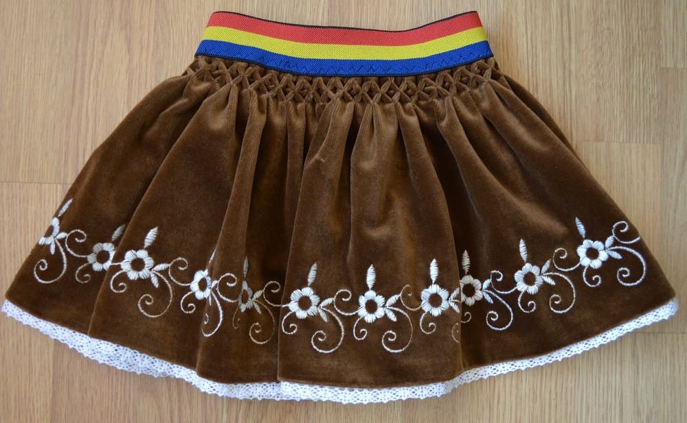 Fustă din catifea de bumbac, cu broderie, dantelă din bumbac alb atașată la poale și cu bata din elastic. Nuanța catifelei și culoarea firului cu care s-a brodat dar și încrețitura făcută manual, în punct de fagure, dau acestei fustițe eleganță și veselie în același timp, ducând-o spre fustele tradiționale bucovinene. Este un produs destinat copiilor, care împreună cu o ie devine o componentă a unei vestimentații etno-tradiționale, ideală pentru serbarea școlară sau alt eveniment la care se impune costumul popular. Măsura neîntinsă a elasticului este de 44cm. iar lungimea este de 26cm.