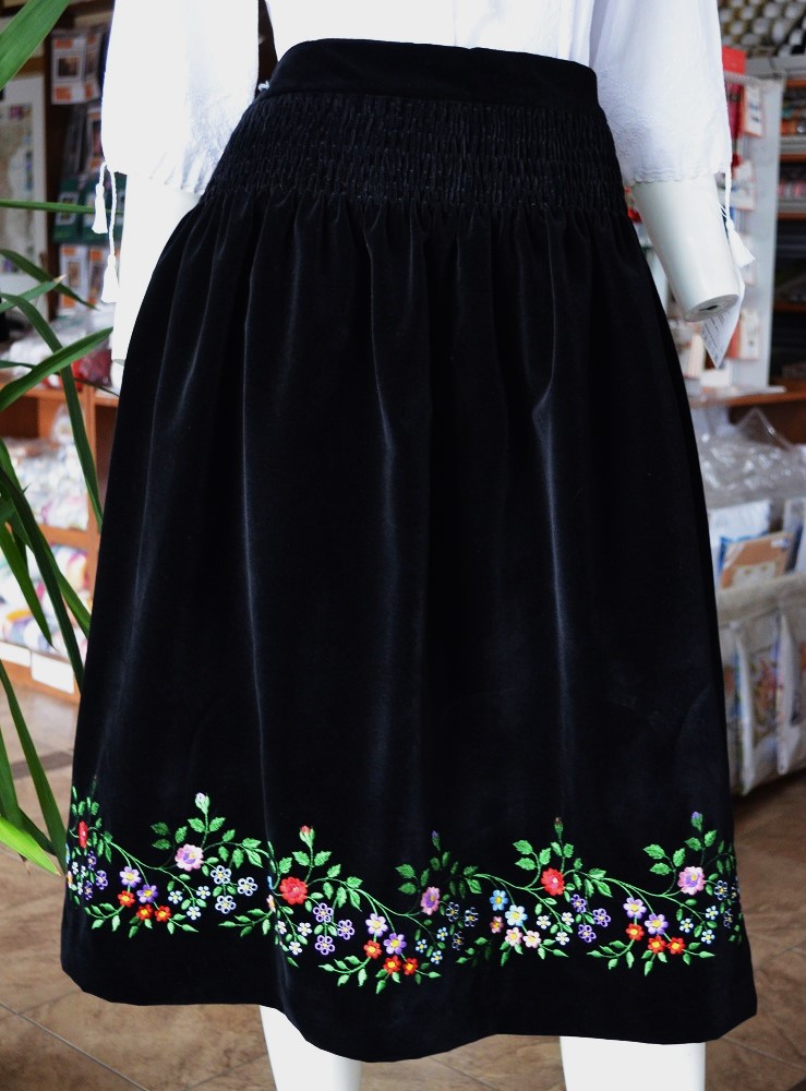 Fustă din catifea de bumbac, cu încrețitură elastică și broderie la mașină. Acest tip de croi este specific fustelor care se poartă și cu cămașă națională, fusta din catifea fiind mai comodă decât catrința. Talia fustei este de 92cm. și lungimea de 68cm.