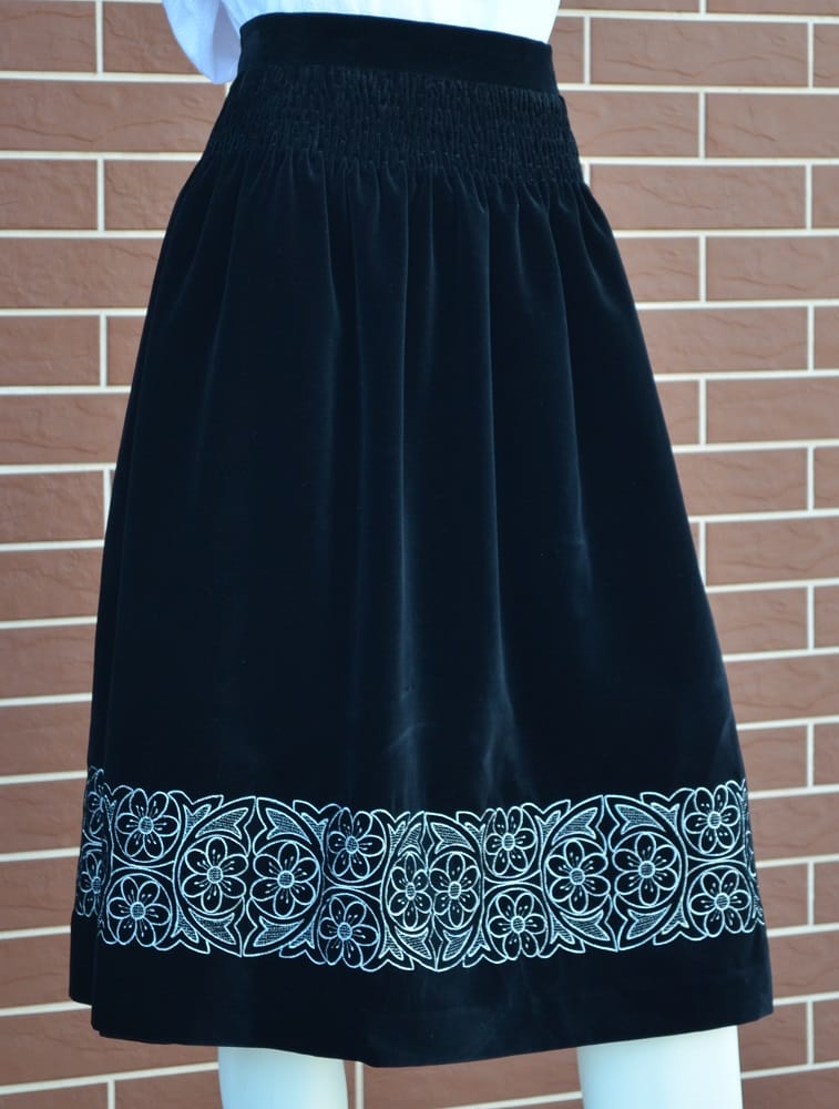 Fustă din catifea neagră bumbac 100%, cu încrețitură elastică în partea de sus, bată fixă și ornamentată cu motiv brodat cu fir argintiu care transformă fusta într-un articol vestimentar ideal pentru ocazii speciale sau sărbători. Fusta are talia de 110cm și lungimea de 64cm. Acest produs poate completa cu succes o ținută cu influențe popular-tradiționale deoarece croiul se potrivește perfect cu cămașa populară, mai ales cea cusută cu mărgele.