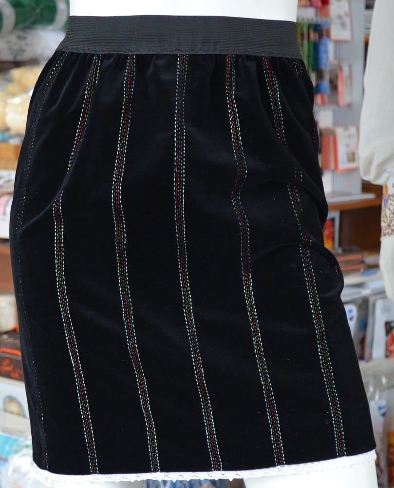 Fustă din catifea, cu motiv cusut cu fir metalic, cu dantelă albă din bumbac la poale și cu bata din elastic. Menționăm că dimensiunea taliei este cu elasticul neîntins. Talie 56cm., lungime 43cm.