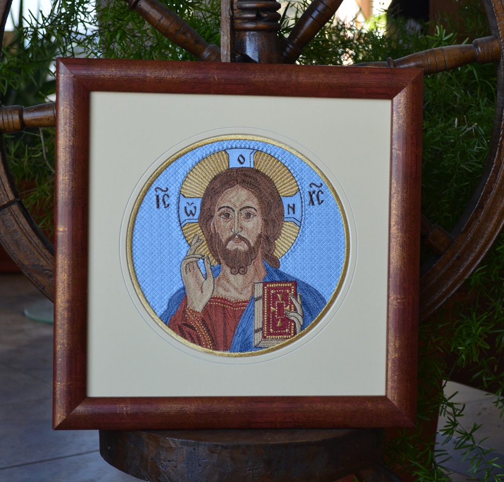 Icoană brodată pe suport de pânză din bumbac, cu secvențe brodate cu fir metalizat auriu și înrămate profesional cu passepartout și ramă din lemn. Dimensiunea icoanei înrămate 31,5 x 31,5cm.