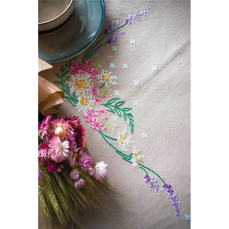 Conținut kit : pânză din bumbac, cu desen imprimat care dispare la spălat, ac special, fire mouline bbc100% marca DMC, instrucțiuni de lucru și imagine color. Modelul se lucrează în punct de cruce, punct de tijă sau cusătură în urma acului și punct de contur. Dimensiunile feței de masă sunt 80 x 80 cm.