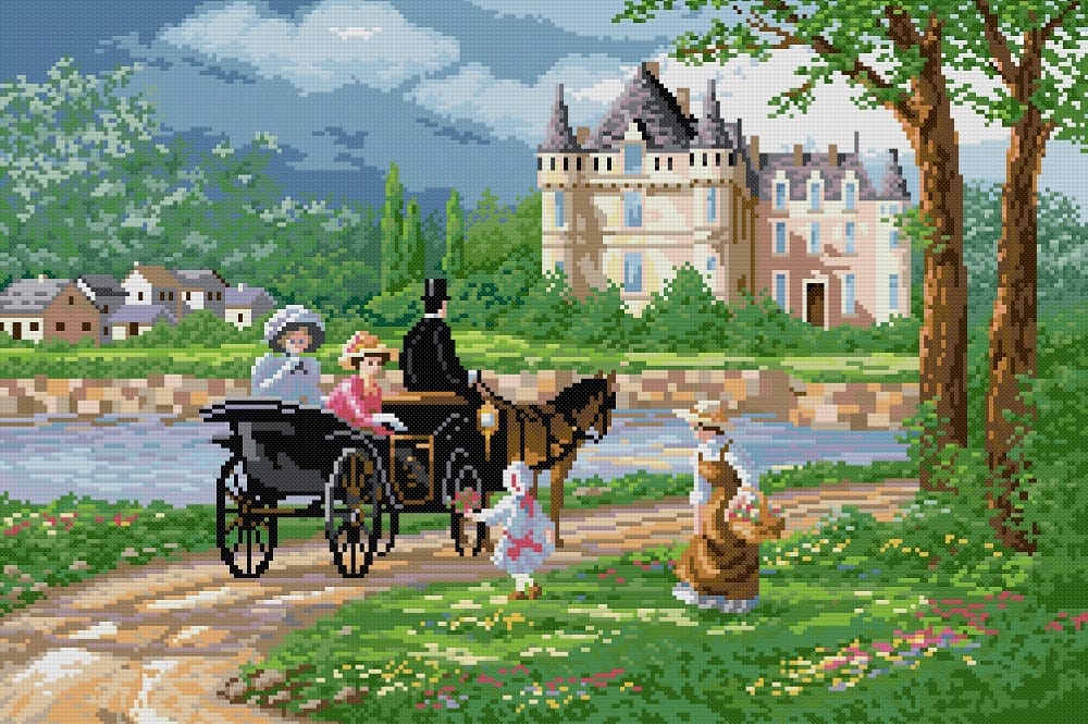 Kit pentru broderie manuală compus din: pânză Zweigart cu 9 fire/cm., fir mouline DMC bumbac 100%, ac special cu vârf bont și ureche alungită, diagramă și instrucțiuni de lucru. Modelul are 45 de culori, se lucrează în punct goblen și dimensiunea modelului cusut este 28/18cm.